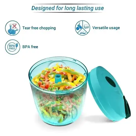 The chopper is made of BPA-Free and Non-Toxic material as a safe food tool. Easily clean and easily use. The chopper is designed with sharp stainless-steel blades for fast chopping, comfortable soft grid lid, anti-slip base and easy pulling cord and a large handle for effortless operation. Try it now and you will love it for sure.